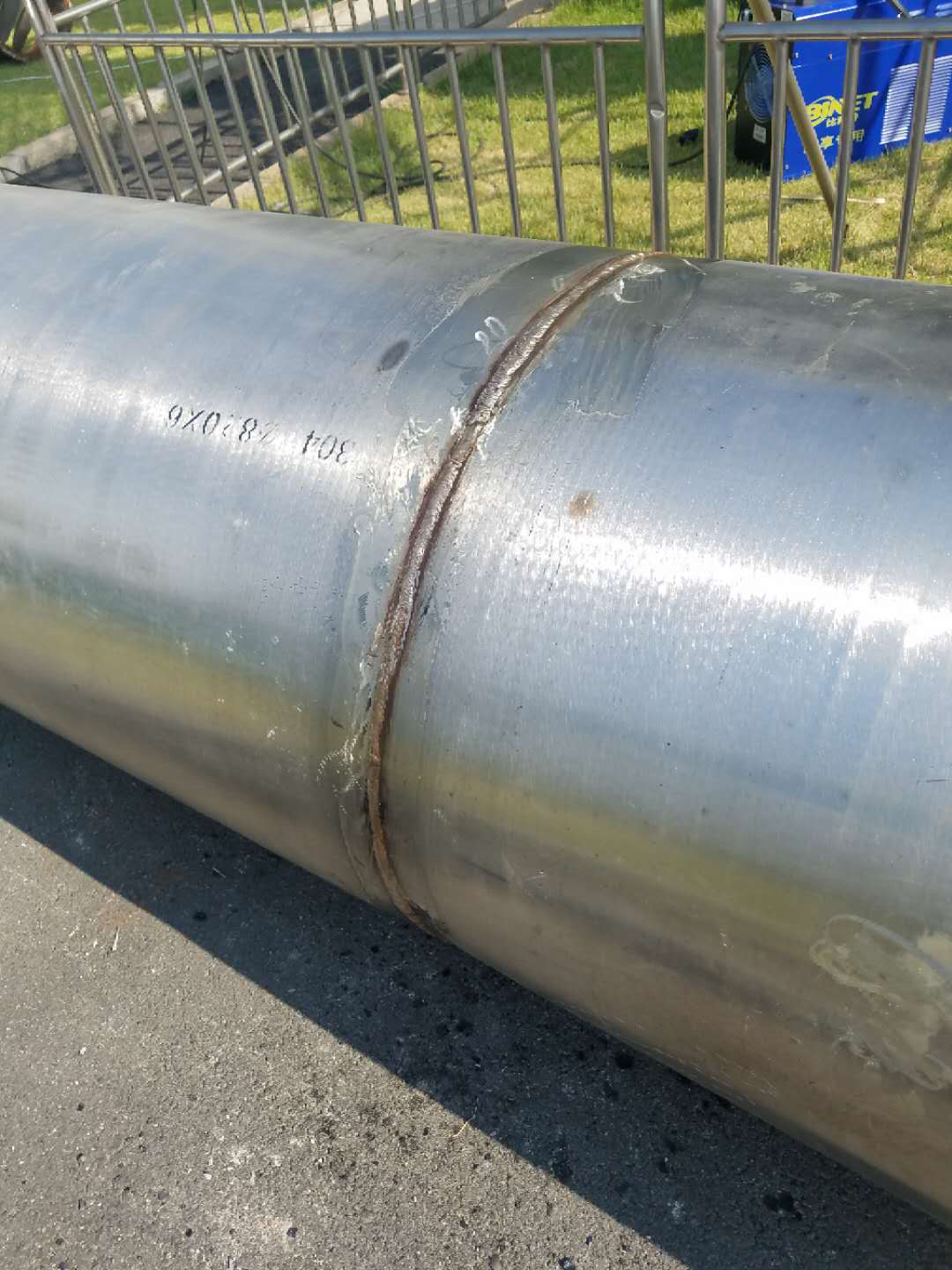 煙囪主管焊接好后對焊口用不銹鋼酸洗膏進行酸洗鈍化處理,由于不銹鋼酸洗膏的主要是硝酸、硫酸、磷酸、氫氟酸等多種酸的混合物作為腐蝕氧化層的主要成分,能夠去掉焊口焊渣的黑色物質(zhì),讓焊口光亮如新,且在焊口位置根據(jù)不銹鋼的抗腐蝕陛性能能發(fā)生鈍化反應,形成一層極薄的(約1nm)致密的保護膜保護焊口,使得焊口更美觀并提高耐腐蝕性能