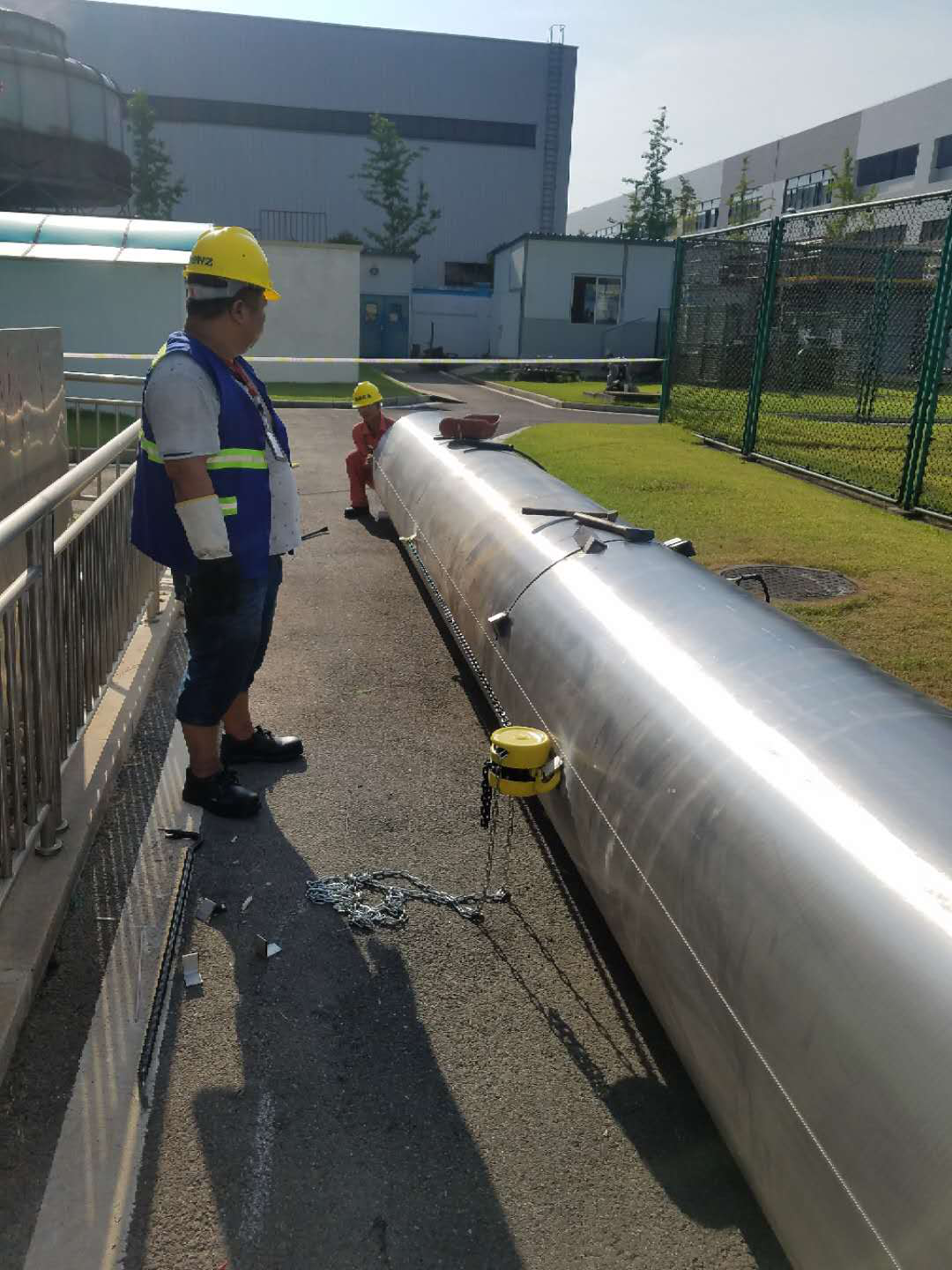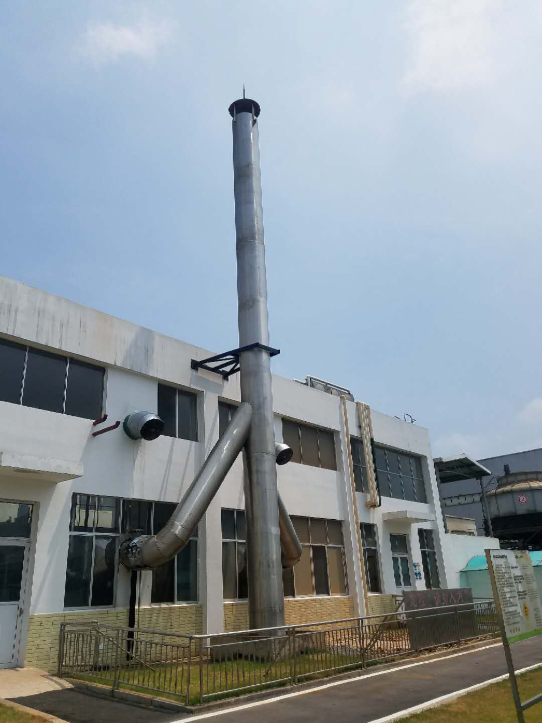 康寶萊星沙工廠鍋爐煙囪使用已達五年之多,原設計為5mm厚普通碳鋼材質(zhì),支管ф600mm,主管ф800mm,垂直高度16m。因在2013年經(jīng)過鍋爐節(jié)能改造后,鍋爐排放的煙氣為低溫煙氣(《75°),煙道內(nèi)冷凝了大部分冷凝水,而中高溫水是強氧化劑,這樣煙氣冷凝水(含硫)對碳鋼煙囪腐蝕氧化嚴重。經(jīng)過專業(yè)檢測人員對鍋爐煙囪做檢測,只有1.5mm厚 ,存在倒塌安全隱患,并且煙囪頂帽固定支桿腐蝕嚴重,有被狂風刮落的安全隱患。由于存在以上的安全隱患,康寶萊公司決定對鍋爐煙囪及材質(zhì)進行更換改造。經(jīng)過多次的對我司考察后,從眾多公司中選取出來,由我星澤公司對承擔煙囪此任務。