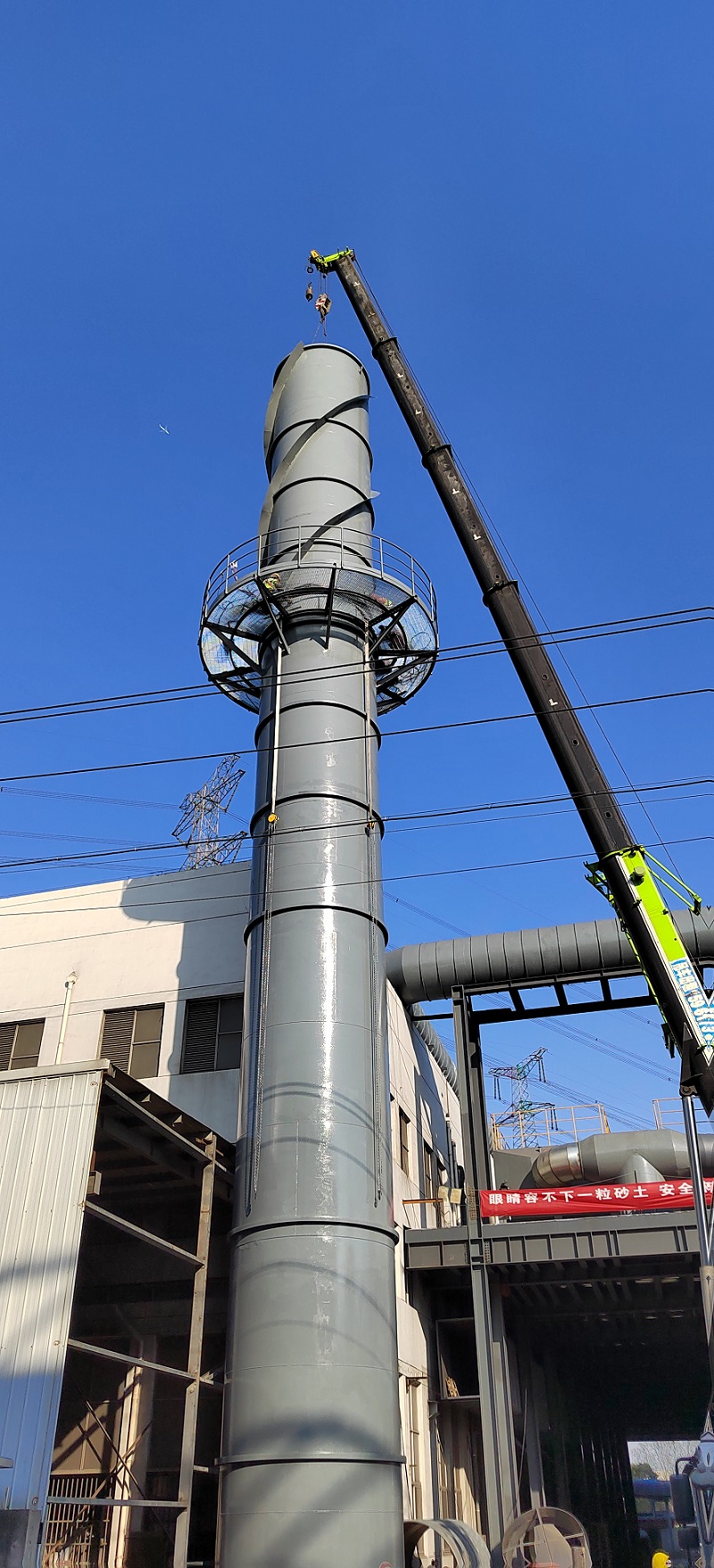我司作為專業(yè)分包安裝單位,負責的項目內容有:三個直徑分別為3.4米4米、4.6米,高度分別為1個8米和2個13米的洗滌塔的制作安裝;兩個直徑分別為2.4米和2.6米的高度均為30米的煙囪制作安裝;甲供6臺大型活性碳吸附箱就位安裝,每臺重量超過15噸,甲供10臺過濾器就位安裝每臺重量也超過6噸,安裝就位高度都是在標高9米的鋼平臺上。還有6臺大功率的風機,其中最大兩臺風量超過17萬;將所有四供設備、洗滌塔、過濾器、吸附箱、風機等用大尺寸風管連接,最大的直接達到了2米,安裝標高16.5米,現場都是用大型吊車安裝就位;廢氣處理需要用的水管道、加藥系統(tǒng)安裝,所有水管道,廢氣管道和設備均有數據監(jiān)控,要實現自動控制設備的運行,監(jiān)控運行情況等。除甲供設備外,其他均為我方制作安裝就位。