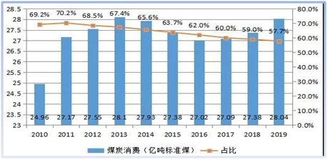 國家能源發(fā)展十三五規(guī)劃:到2020年,能源消耗總量控制在50億噸標(biāo)準(zhǔn)煤以內(nèi)。2019年全國煤炭消費(fèi)量約28.04億噸標(biāo)準(zhǔn)煤,煤炭消費(fèi)量占能源消費(fèi)總量的57.7%。