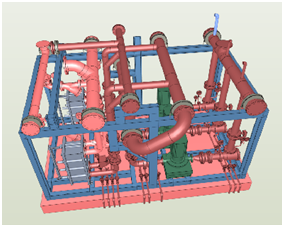 2) 按照廠家提供的機(jī)組、水泵等設(shè)備和閥門、過濾器等附件的尺寸大樣圖, 進(jìn)行1:1精確建族,使整個機(jī)房內(nèi)的管道、設(shè)備、構(gòu)件等全部遵照實(shí)際尺寸比例,然后綜合考慮各方因素對機(jī)房模型調(diào)整優(yōu)化,待機(jī)房方案例如排水溝位置、設(shè)備布置方案、管道排布走向確定后,對管道進(jìn)行合理分段劃分,并進(jìn)行BIM建模;