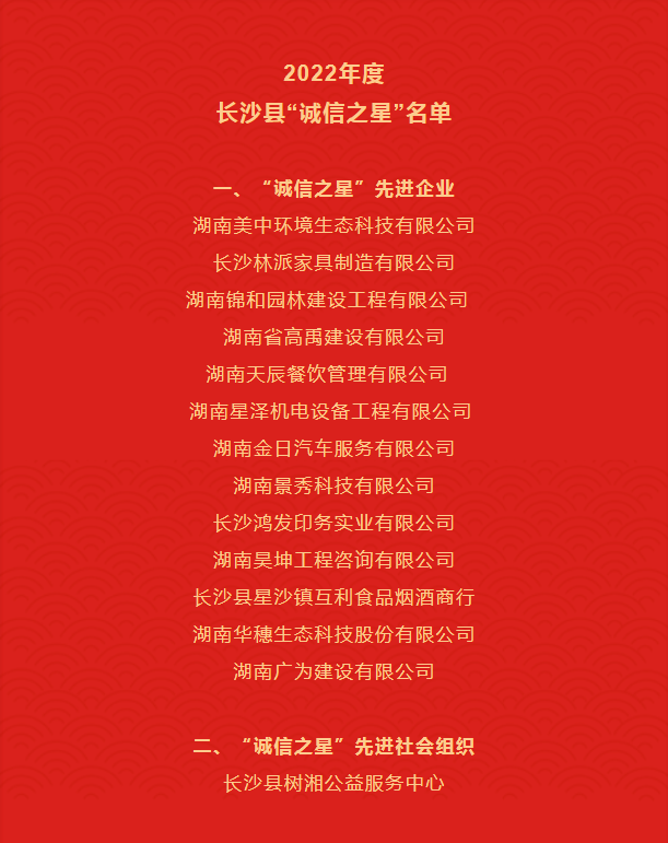 12月1日,長沙縣2022年“誠信之星”名單正式公布。經(jīng)長沙縣社會(huì)信用體系建設(shè)領(lǐng)導(dǎo)小組辦公室批準(zhǔn),授予湖南錦和園林建設(shè)工程有限公司等13家單位“誠信之星”先進(jìn)企業(yè)稱號(hào),授予長沙縣樹湘公益服務(wù)中心“誠信之星”先進(jìn)社會(huì)組織稱號(hào),授予黃明海等9名同志“誠信之星”先進(jìn)個(gè)人稱號(hào)。