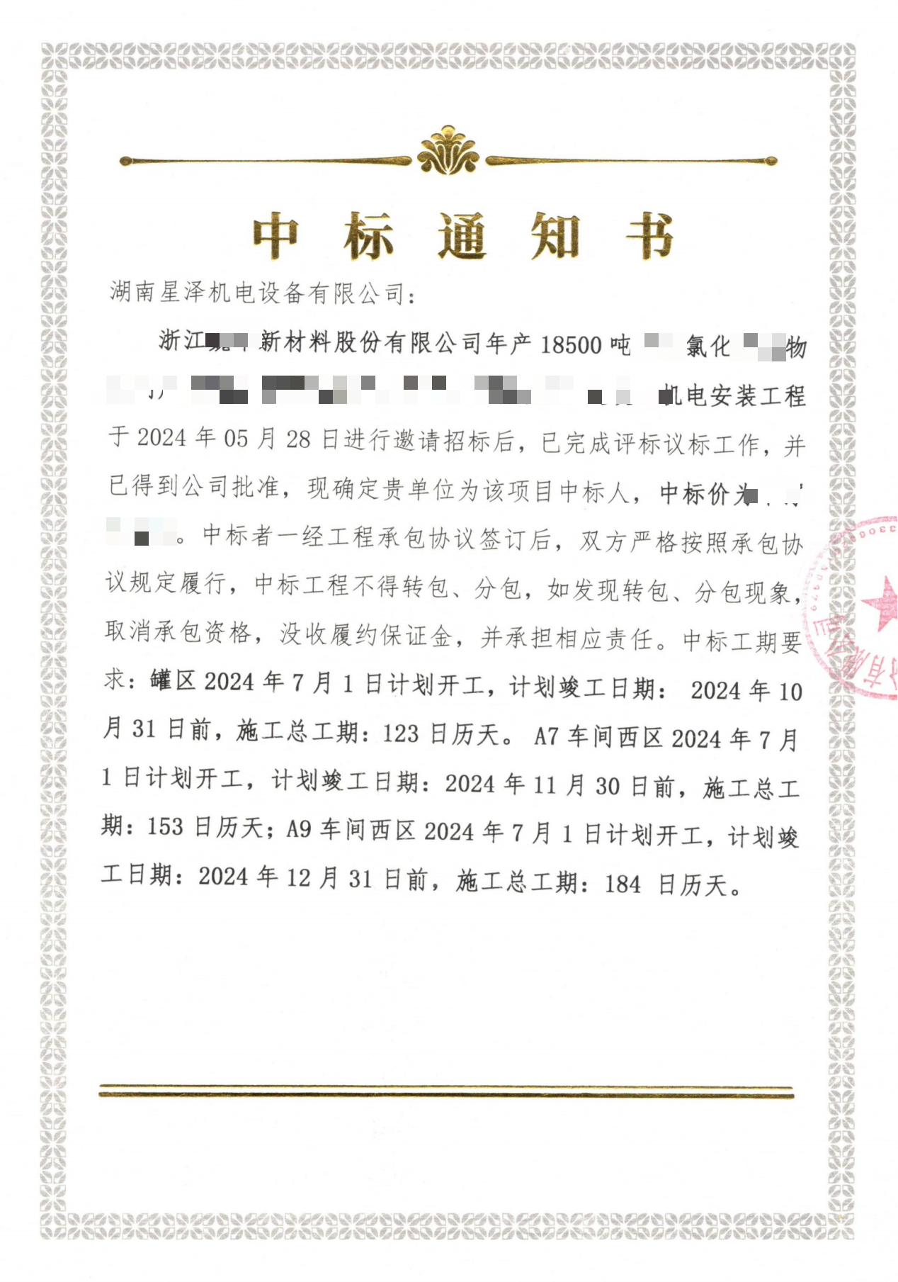 2024年6月13日,公司成功以1300萬投標(biāo)報(bào)價(jià),成功中標(biāo)浙江一新材料公司18500噸氯化工項(xiàng)目機(jī)電安裝工程。