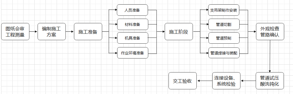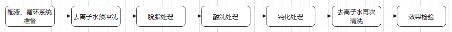 為保證潔凈管道系統(tǒng)內(nèi)表面的潔凈程度,使所輸送的潔凈介質(zhì)不與管道內(nèi)表面的金屬離子發(fā)生化學反應,不污染介質(zhì),以保證產(chǎn)品質(zhì)量,必須對管道內(nèi)表面進行脫脂、酸洗、鈍化處理,具體流程如下圖所示。